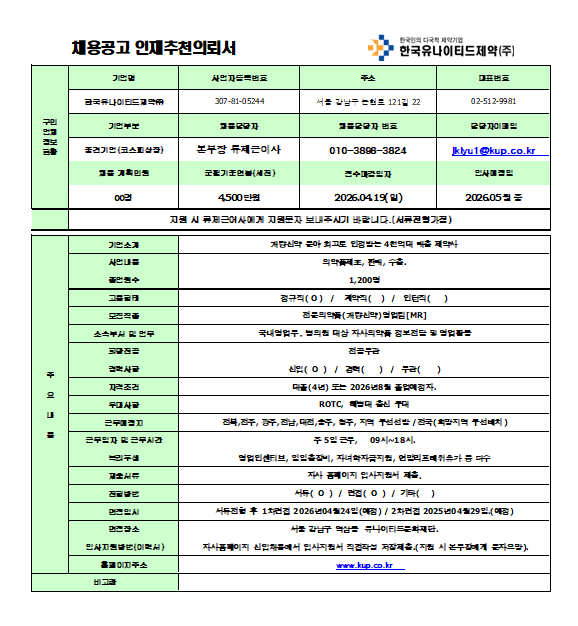 - 제출방법 : 한국유나이티드제약(주) 홈페이지 지원 후 추천채용담당자(063-850-7592, 권혁남)에게 지원내용을 알려주시면 서류전형 우대사항 적용됩니다
