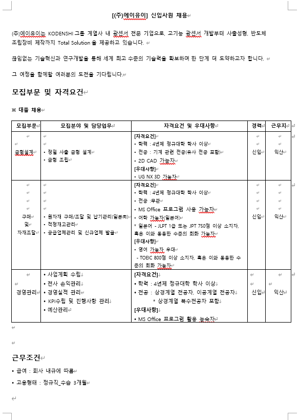 - 파일 제목은 '(주)에이유이_지원직무_성명' (예>(주)에이유이_구매자재_홍길동) 형태로 제출해주시기 바랍니다