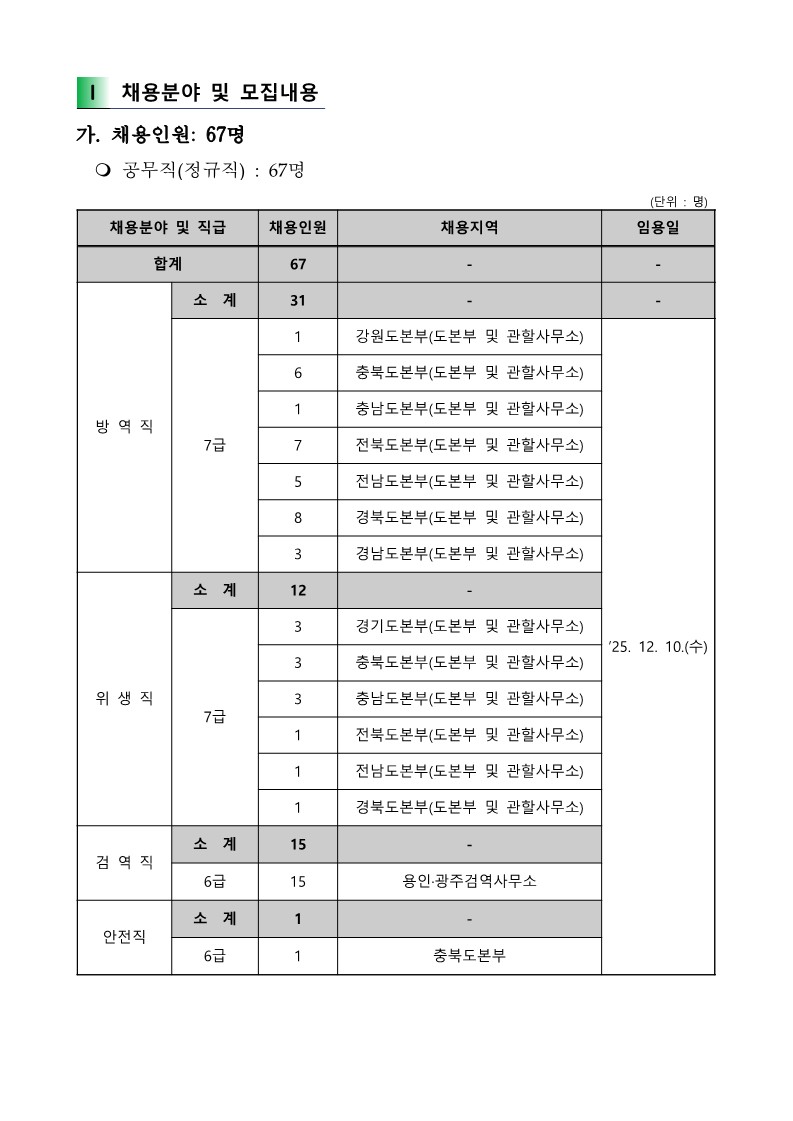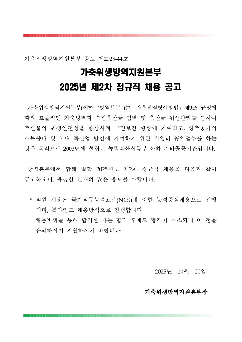 가축위생방역지원본부 2025년 제2차 정규직 채용 공고