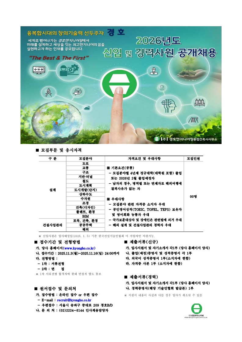 (주)경호엔지니어링 2026년도 신입 및 경력사원 공개채용