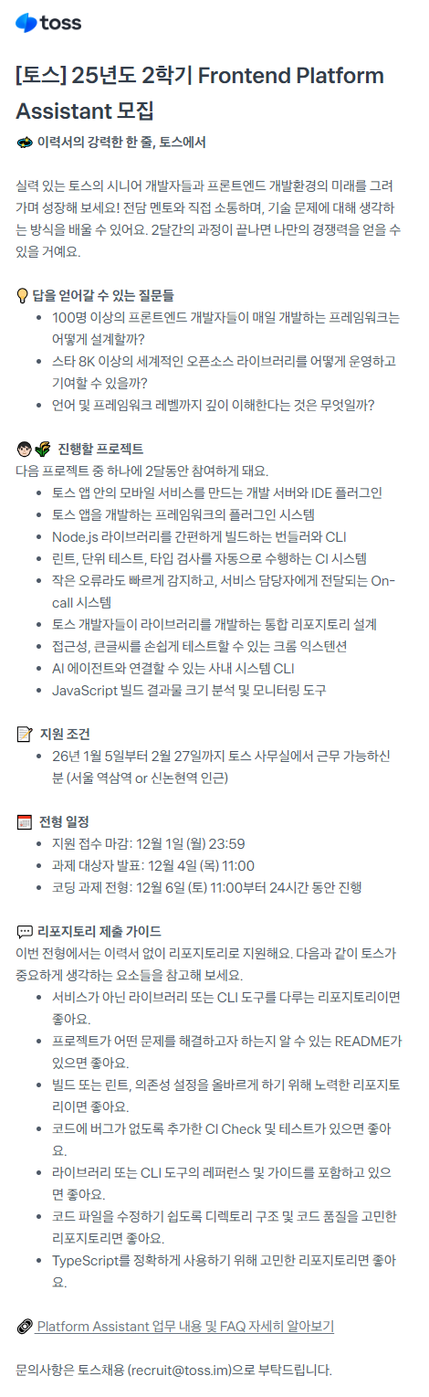 토스 25년도 2학기 Frontend Platform Assistant 모집 |