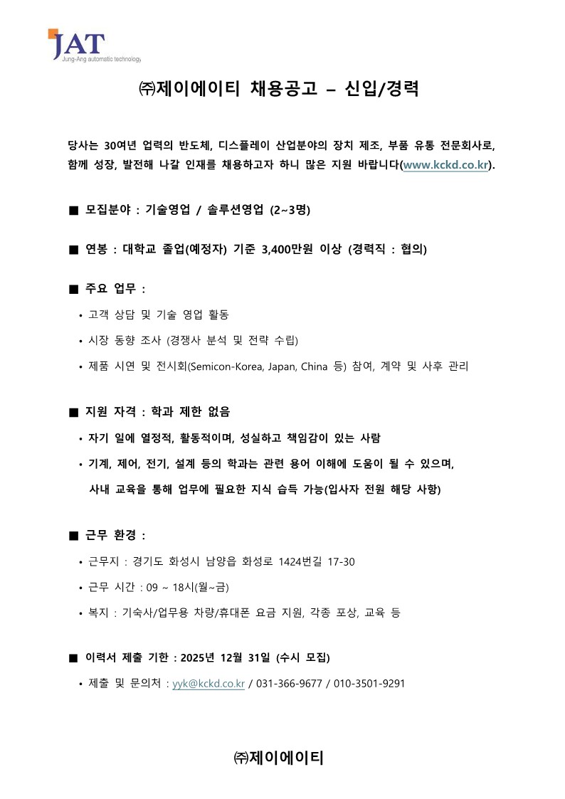 (주)제이에이티 채용공고(신입/경력, 기술영업/솔루션영업)