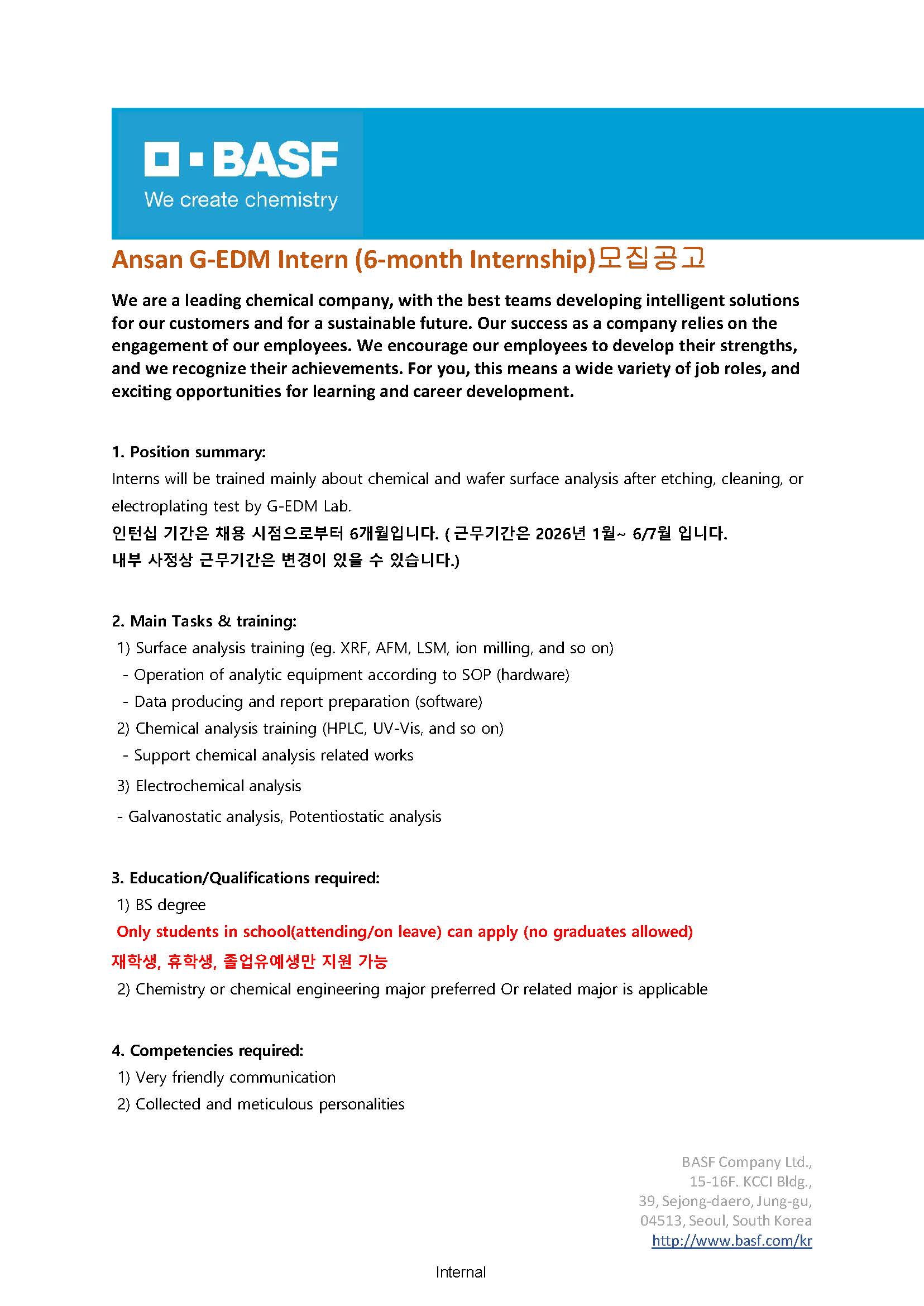 한국바스프 안산연구소 G-EDM Intern 모집
