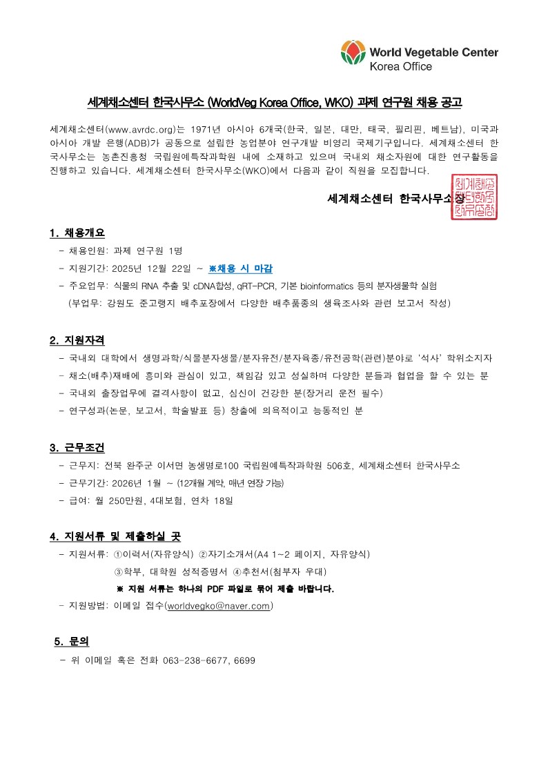 세계채소센터 한국사무소(WorldVeg Korea Office, WKO) 과제 연구원 채용 공고