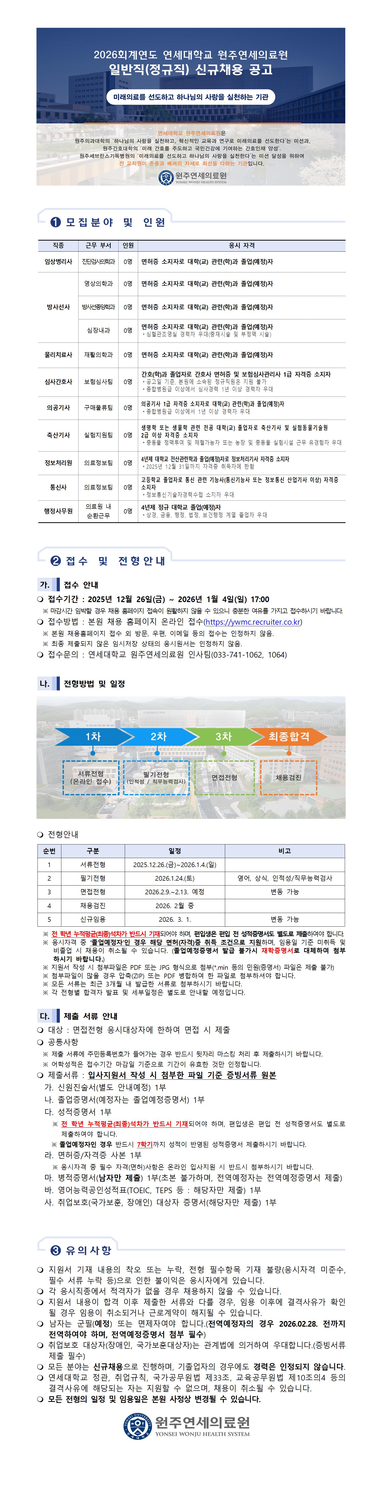 연세대학교 원주연세의료원 2026년 일반직(정규직) 채용