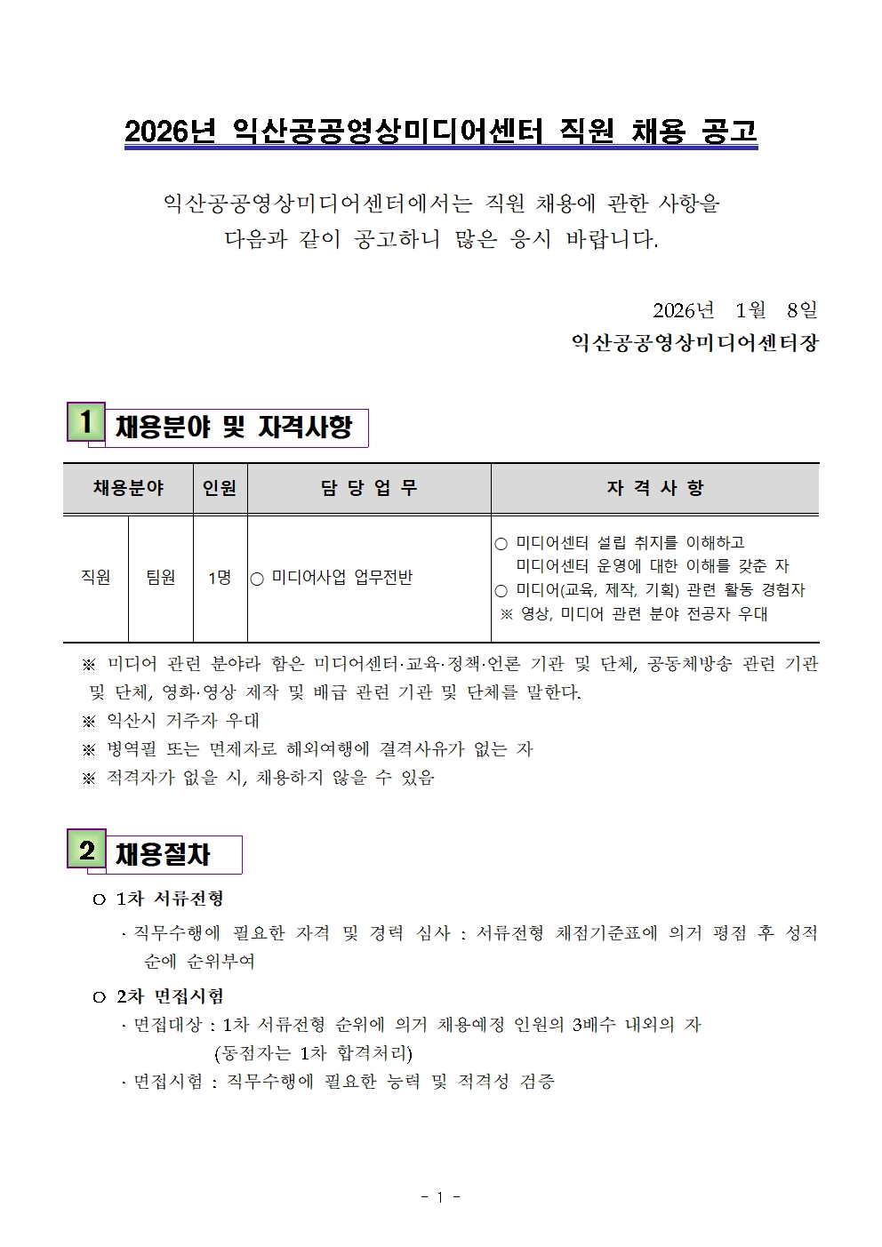 2026년 익산공공영상미디어센터 직원 채용 공고