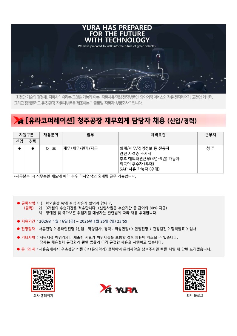[유라코퍼레이션]청주공장 재무회계 담당자 채용(신입/경력)