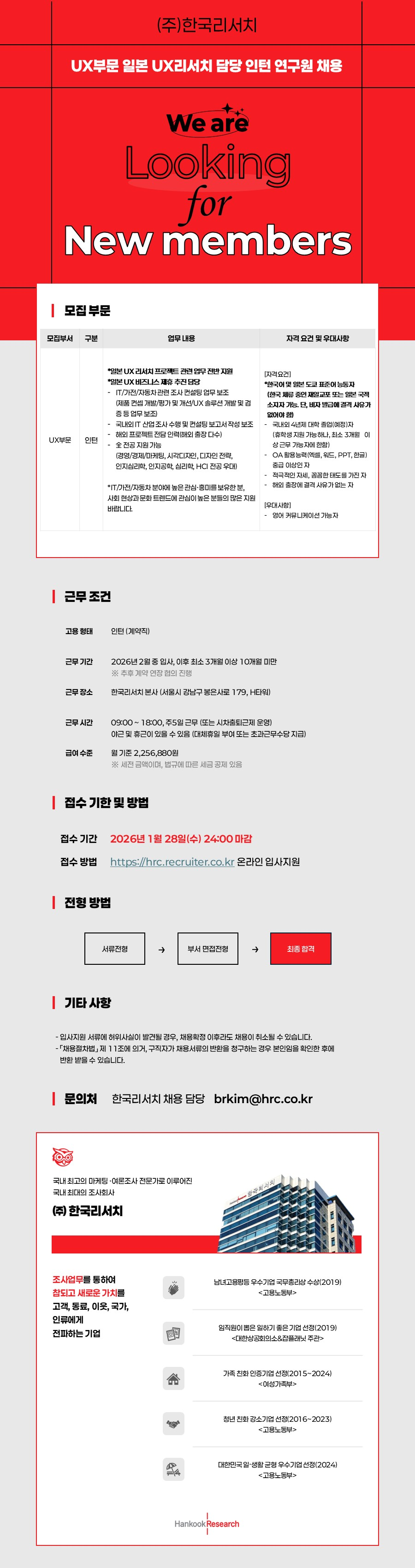 한국리서치 UX부문 일본 UX리서치 담당 인턴 연구원 채용