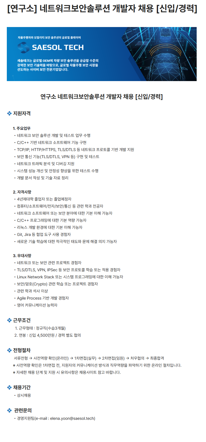 새솔테크 네트워크보안솔루션 개발자 채용[신입/경력]