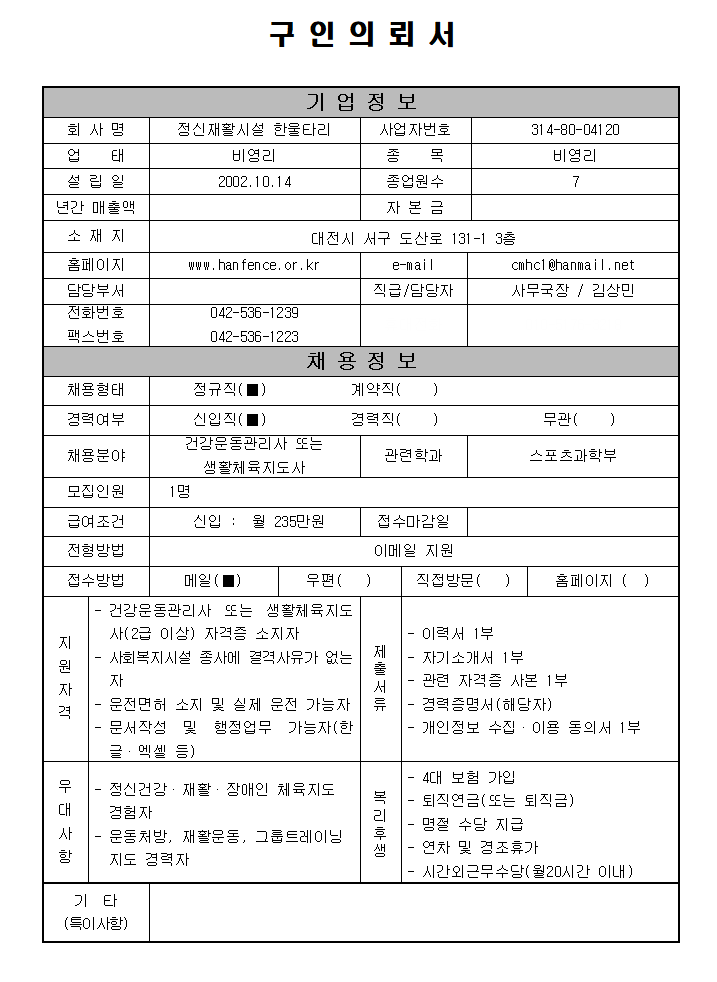 정신재활시설 한울타리 생활체육지도사 채용 공고