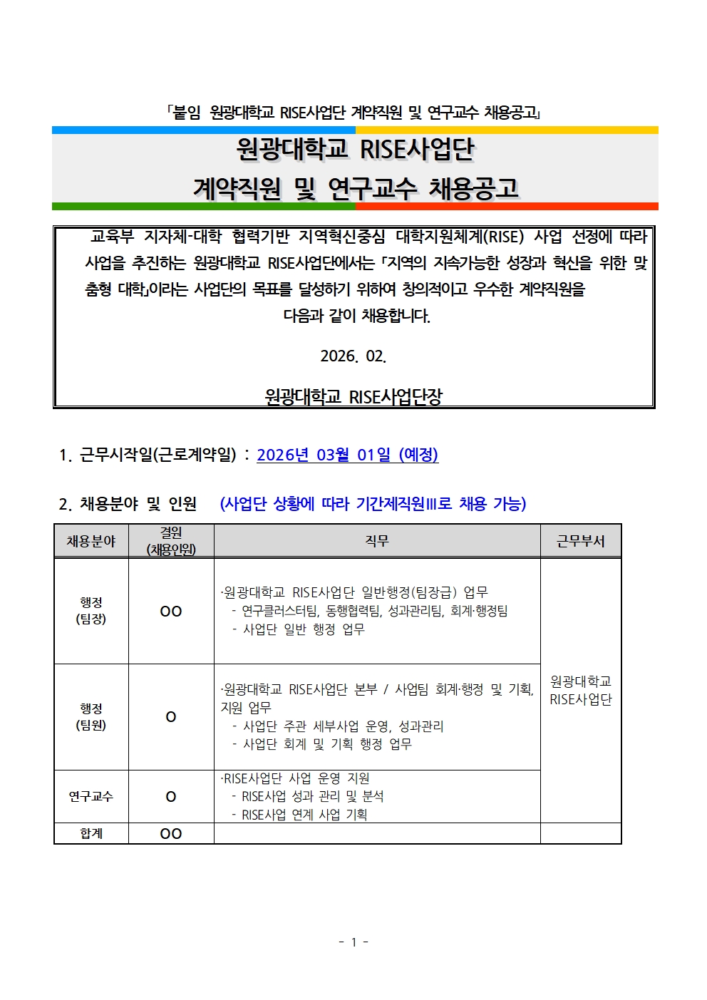 원광대학교 RISE 사업단 계약직원 및 연구교수 채용공고
