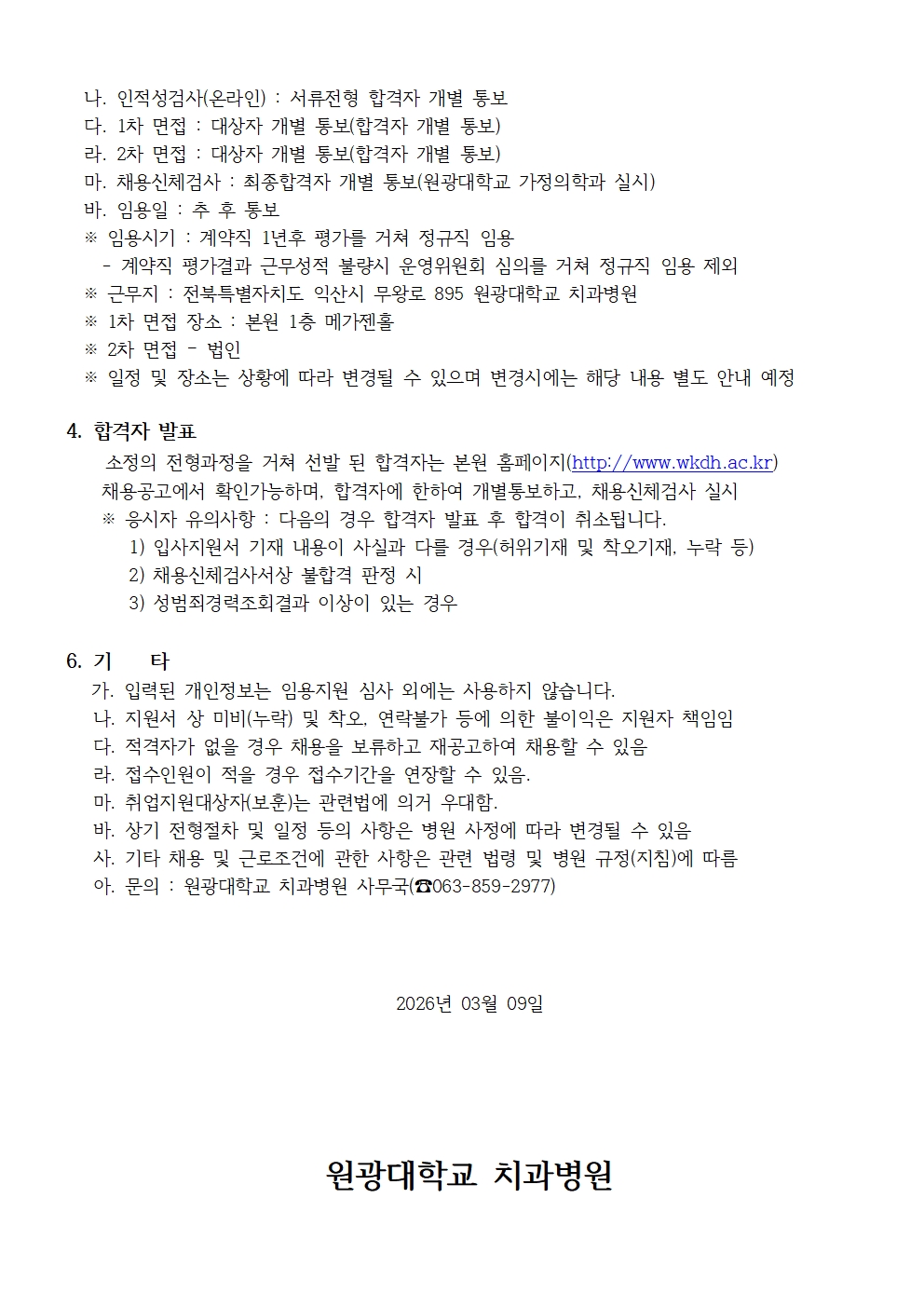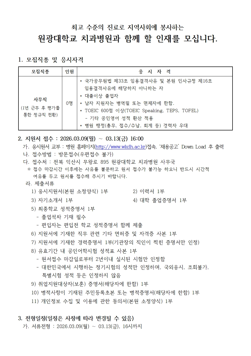원광대학교 치과병원 사무직 채용 공고