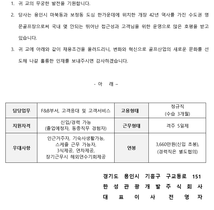 한성컨트리클럽 직원 채용(F&B부서, 고객응대 및 고객서비스)
