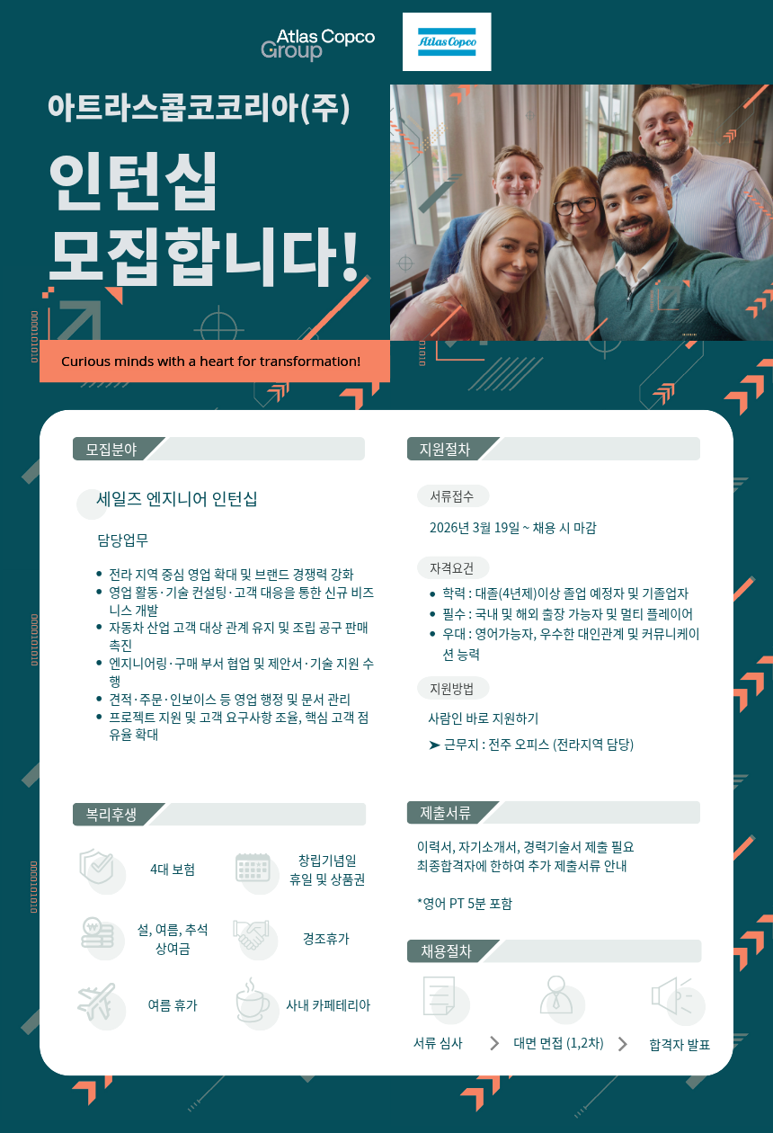 아트라스콥코코리아(주) 세일즈 엔지니어 인턴십 모집