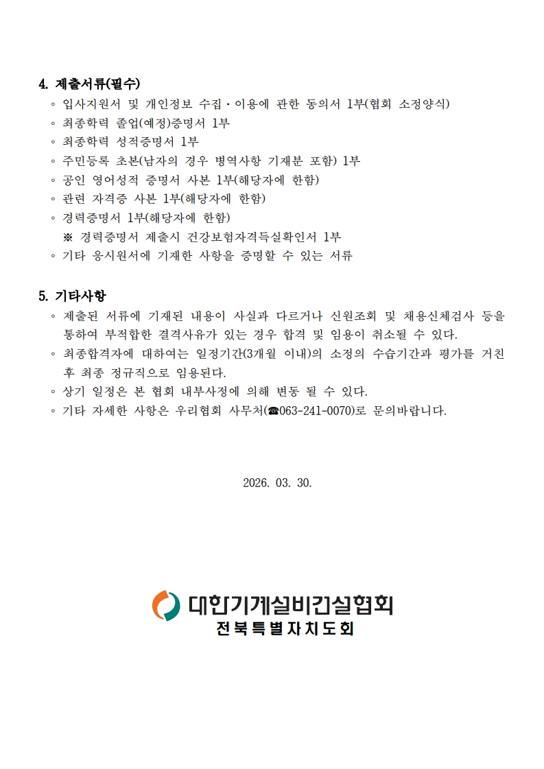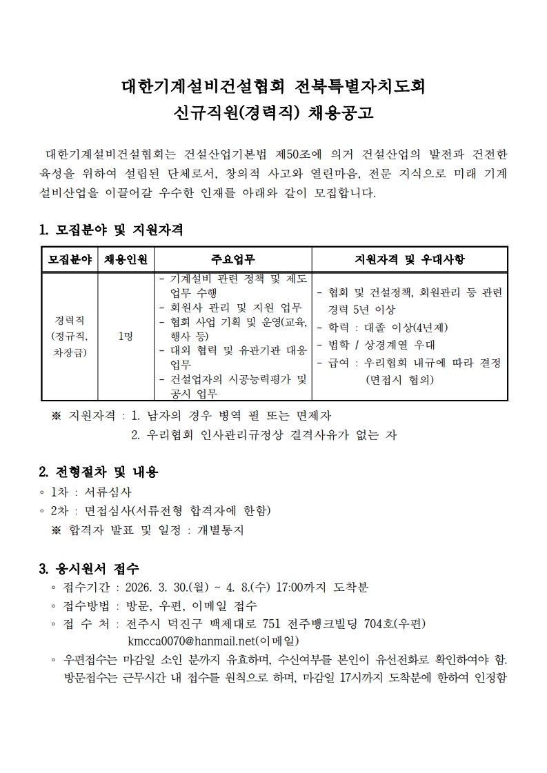 대한기계설비건설협회 전북특별자치도회 신규직원(경력직 및 신입직) 채용공고