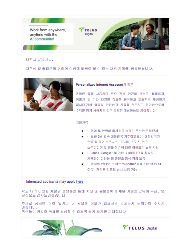 [TELUS Digital]Personalized Internet Assessor 재택근무 프리랜서 직무 상시 채용공고(영어사용)