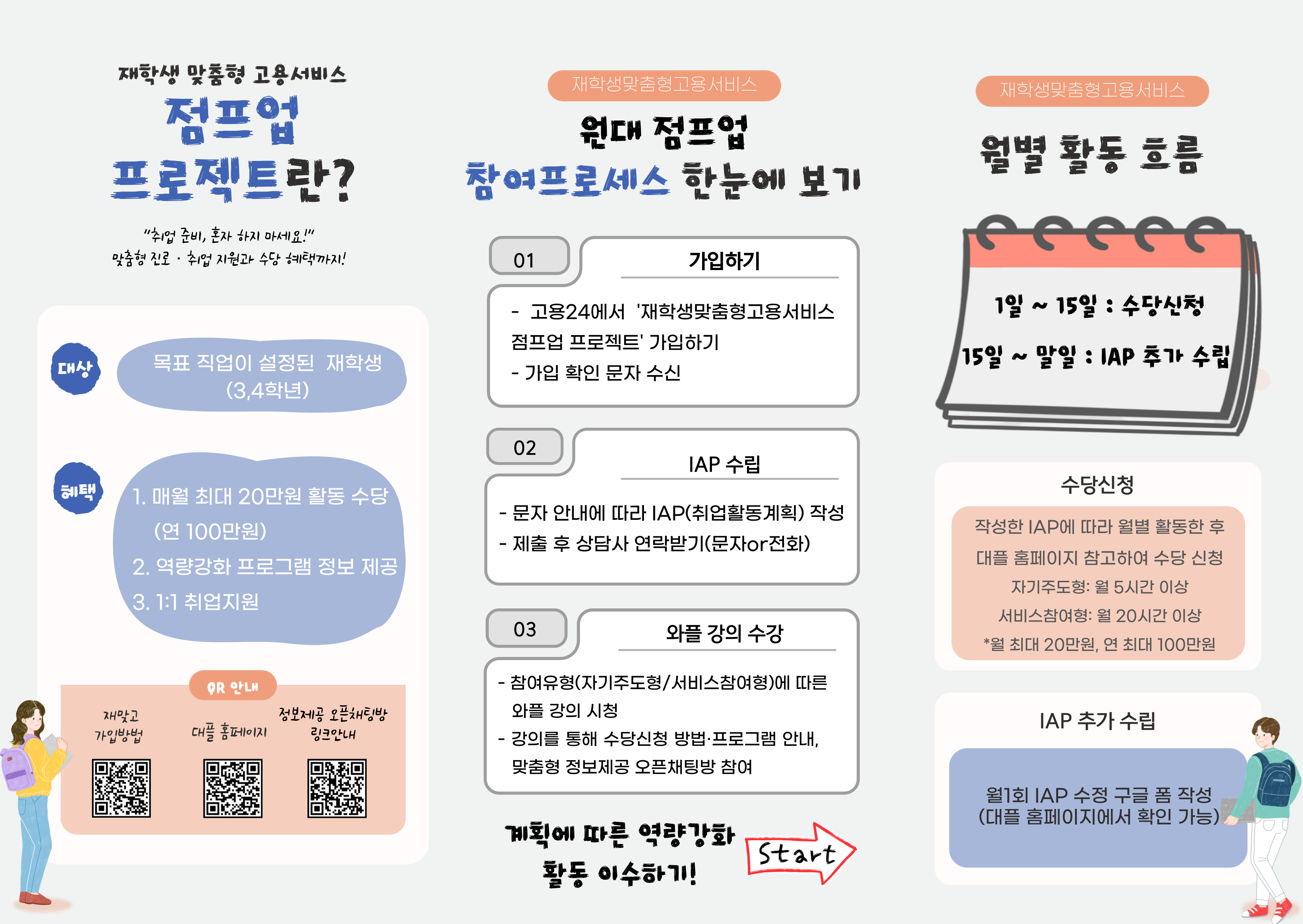 적극적으로 돕는 정부 지원 사업입니다. 졸업 전에 탄탄하게 진로를 설계하고 취업 역량을 쌓을 수 있도록 도와드립니다!